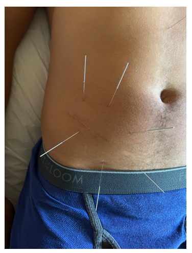 Puncture (30G, 1.5 Cun) of local and peripheral scar tissue to restore the gliding planes of the abdominal aponeurosis and thoracolumbar fascia expansions. Significant reduction in back pain is observed from the first session. Note that the needle placement is not necessarily very close to the scar. The visible scar does not always correspond to the internal damage and compensations of the connective tissues. It is therefore important to develop palpation skills to follow the direction and the depth of the adherances and fascial dysfunctions.